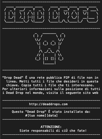 Dead Drops è una rete di scambio anonima, non in linea e “PEER to PEER” (P2P) attraverso luoghi pubblici. Chiunque può accedere a Dead Drops e chiunque può installare un Dead Drop nella propria regione o città. Un Dead Drop deve essere accessibile a tutti. Un Dead Drop in un edificio chiuso al pubblico o in un luogo privato con accesso limitato o temporaneo non è un Dead Drop.