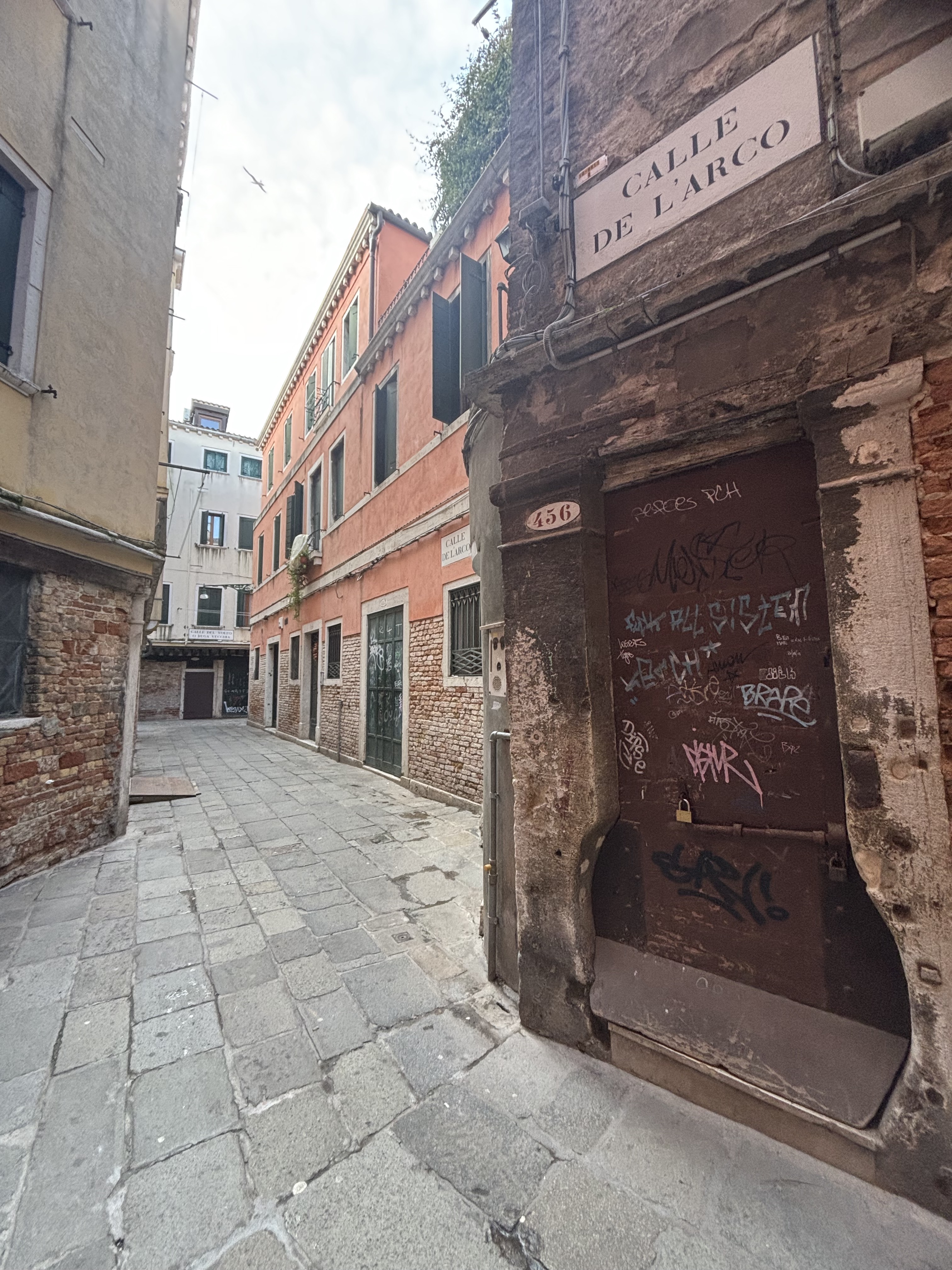 Come ben sapete, i commerci di ogni genere a Venezia hanno da sempre prosperato. Quest’area al civico 456, la tappa intermedia della mappa a fine articolo, era un brulicare di artigiani intenti nella produzione di botti in legno, che spesso venivano fatte rotolare per comodità. Venezia, come tante altre città, ha abitazioni con porte strette e alte, rendendo difficile far passare le botti, ovunque tranne che in Calle de l’Arco, dove i titolari di uno stabilimento crearono un vano d’entrata sagomato appositamente per la forma delle botti. Come potete vedere dalle immagini, l’ingegno supera sempre ogni ostacolo!