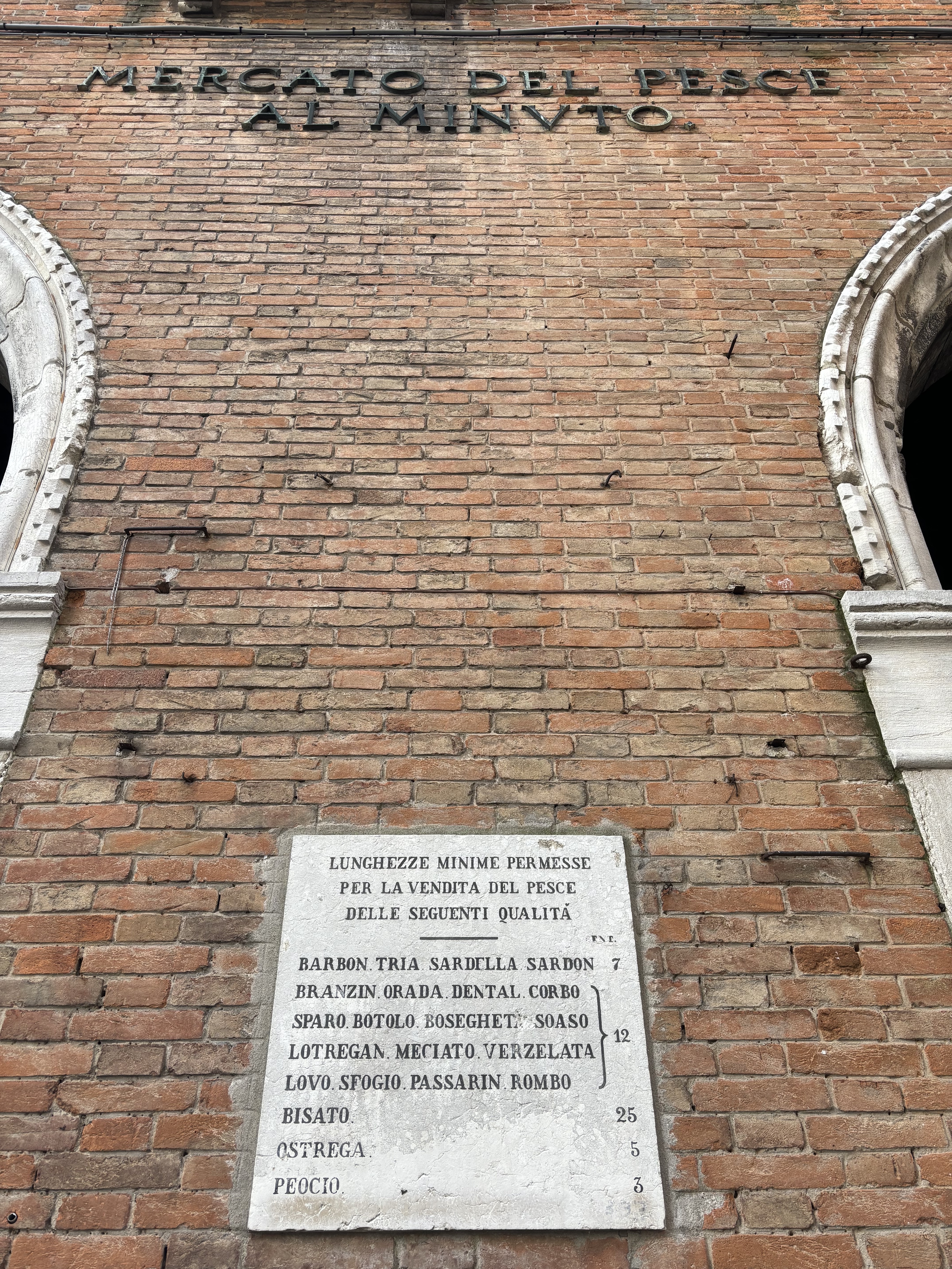 Vi segnalo inoltre una particolarità interessante: la Pescheria si divide in due logge, e nel corridoio che le separa, proprio sotto l’insegna “Mercato del Pesce al Minuto”, all’esterno dell’edificio, è affissa una targa marmorea. Questa targa indica le lunghezze minime consentite per la vendita di diverse tipologie di prodotti ittici. Un segno tangibile di come, anche in epoche passate, si prestasse grande attenzione alla tutela del patrimonio marino e alla sostenibilità della pesca.
