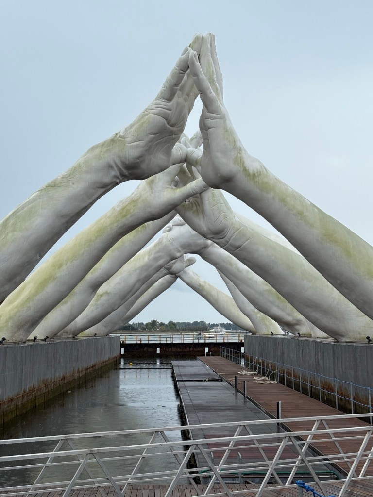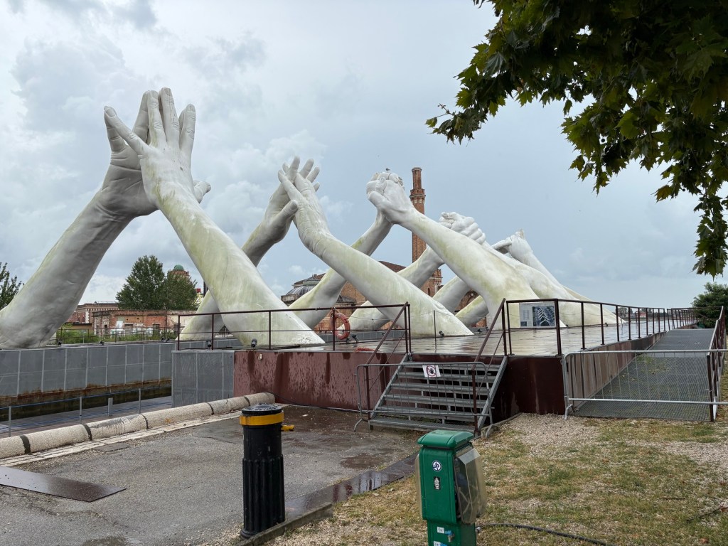 In questa zona dell’Arsenale si trovano due attrazioni particolari: “Building Bridges” di Lorenzo Quinn, installata nel 2017. Si tratta di sei coppie di mani monumentali alte 15 metri e larghe 20, che attraversano simbolicamente il bacino dell’Arsenale. Queste sculture rappresentano valori come “Amicizia”, “Fede”, “Aiuto”, “Amore”, “Speranza” e “Saggezza”, invitandoci a riflettere su un’umanità migliore.