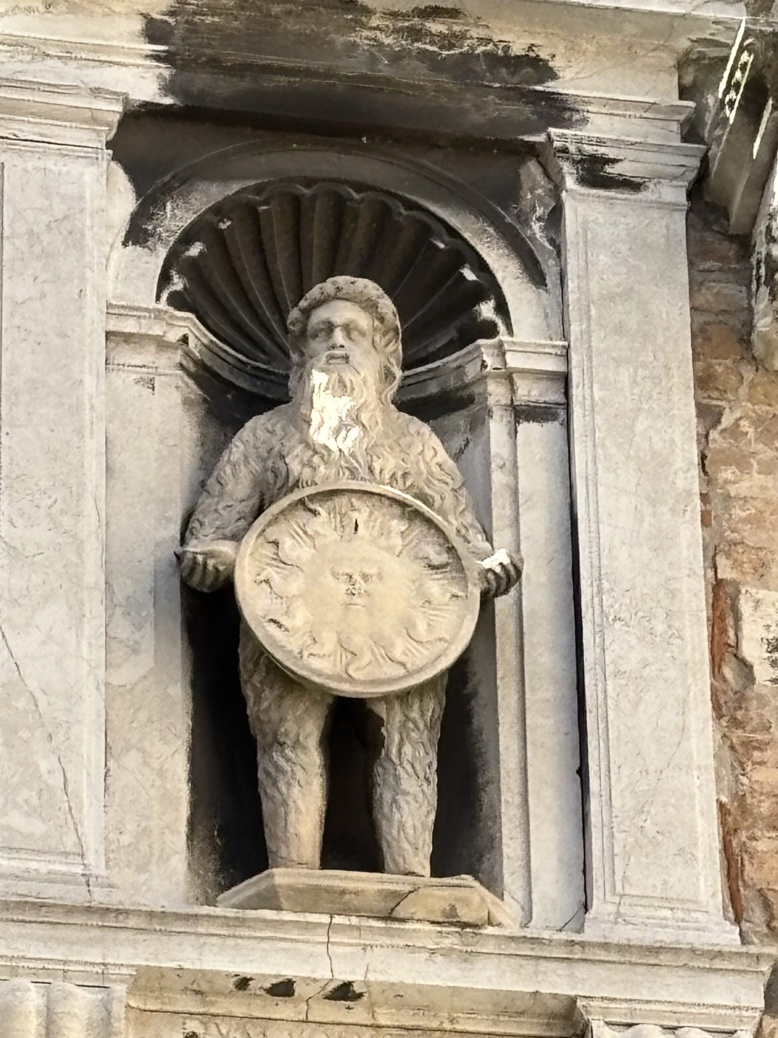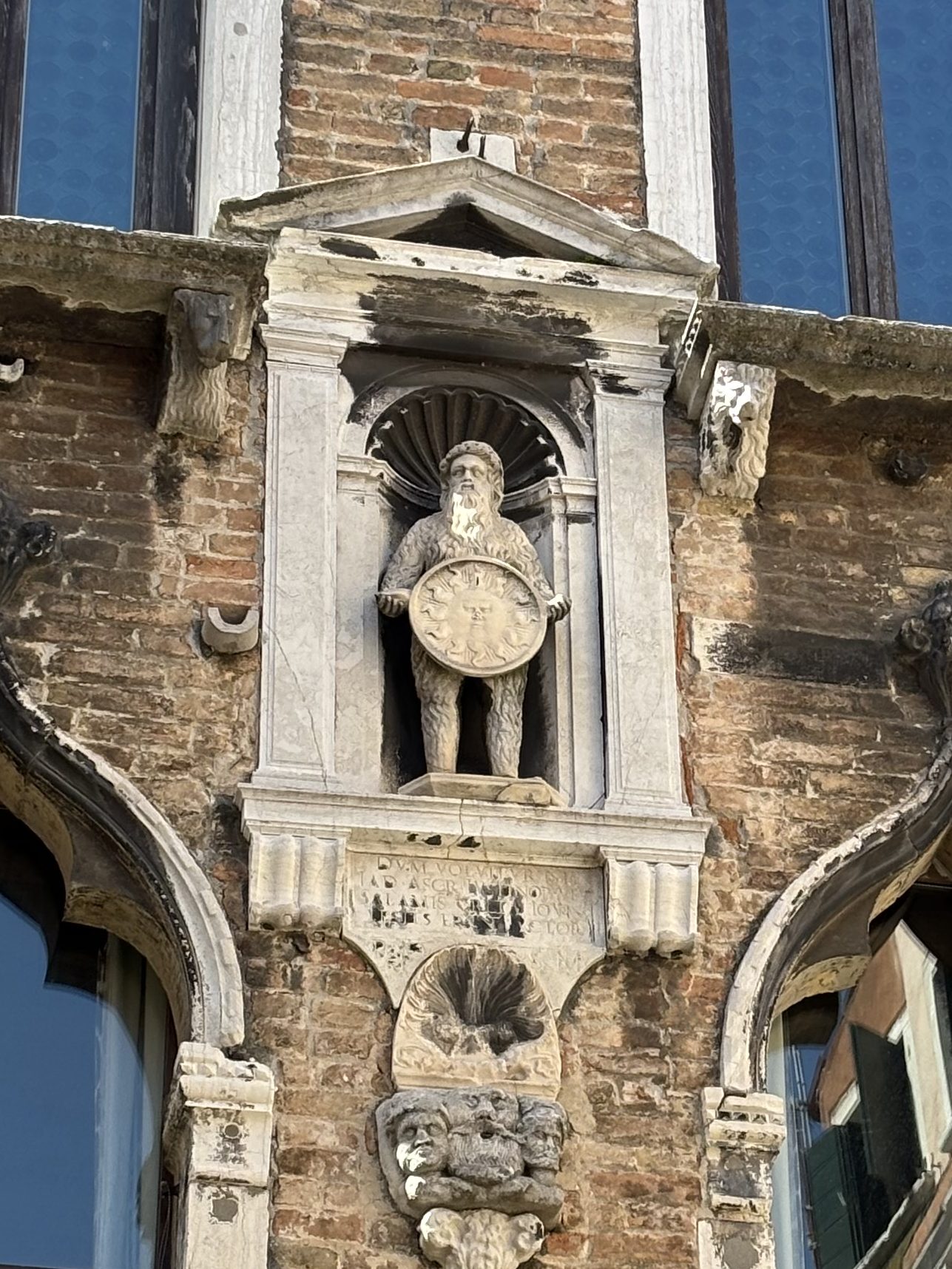 Secondo la tradizione, fu il patrizio Gianmatteo Bembo – figura colta e appassionata di alchimia e conoscenze esoteriche – a volere questa singolare rappresentazione. Non è un caso se il “vecchio” stringe tra le mani un disco solare, simbolo del tempo che scorre e dell’ordine cosmico. Al di sotto della nicchia, trova posto anche una conchiglia di San Giacomo, altro potente emblema caro agli alchimisti, legato alla ricerca della conoscenza universale.