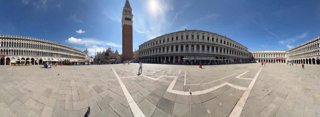 Ogni giorno, Piazza San Marco diventa un palcoscenico silenzioso, dove il sole e l’ombra danzano nel silenzio. Al mattino, i raggi che si insinuano tra campanile e basilica proiettano ombre lunghe verso ovest, protendendo ombra verso le Procuratie. Nel pomeriggio poi, il sole scappa verso ovest e le ombre si ribaltano verso est, come se la piazza stessa misurasse il tempo, trasformandosi in una grandissima meridiana. Chi cammina tra i tavoli e le colonne può osservare questo lento movimento e farsene parte, un gioco antico, discreto e perfetto, che da secoli accompagna i veneziani nel loro rito quotidiano.