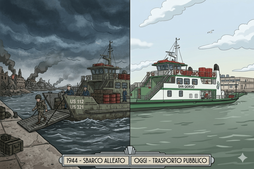 Sotto la vernice bianca e verde di alcuni vecchi traghetti batteva il cuore di un guerriero. Nel dopoguerra, con i cantieri navali stremati e una città che urlava voglia di ripartire, l’ACNIL (l’antenata dell’ACTV) compì un’operazione che oggi definiremmo di un riciclo creativo e geniale. Acquistò dai residuati bellici alleati due imponenti LCT (Landing Craft Tank): mezzi da sbarco nati per trasportare carri armati e truppe sulle spiagge della Normandia e della Sicilia. Ribattezzati “San Giorgio” e “San Marco”, questi giganti d’acciaio subirono una metamorfosi incredibile.