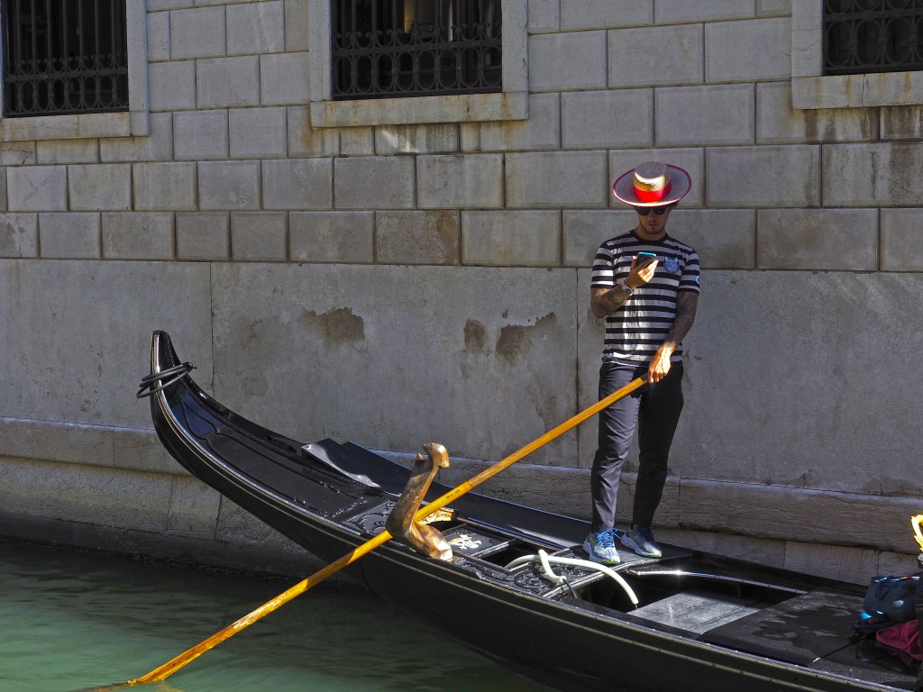 Un gondoliere che sembra guardare le mappe, ma che in realtà si rilassa in attesa di attraccare