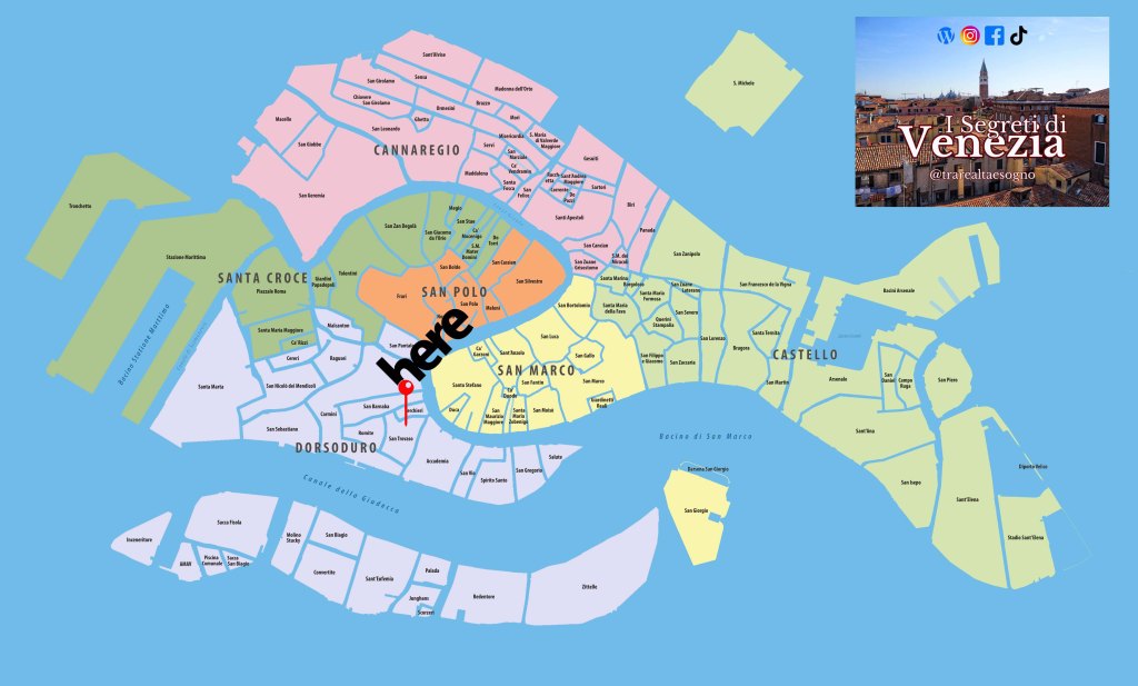 Per una navigazione completa, nella pagina indice di tutti gli articoli troverai lo stesso approccio: ogni segreto, oltre alla classica divisione per Sestiere, è collegato alla sua posizione sulla mappa, pronta a guidarti tra i misteri, le storie e le leggende di Venezia. La maggior parte degli articoli è geolocalizzata nel punto reale in cui si svolgono i fatti, mentre alcuni trovano una collocazione più “metaforica”, evocando luoghi legati al racconto più che alla posizione fisica.