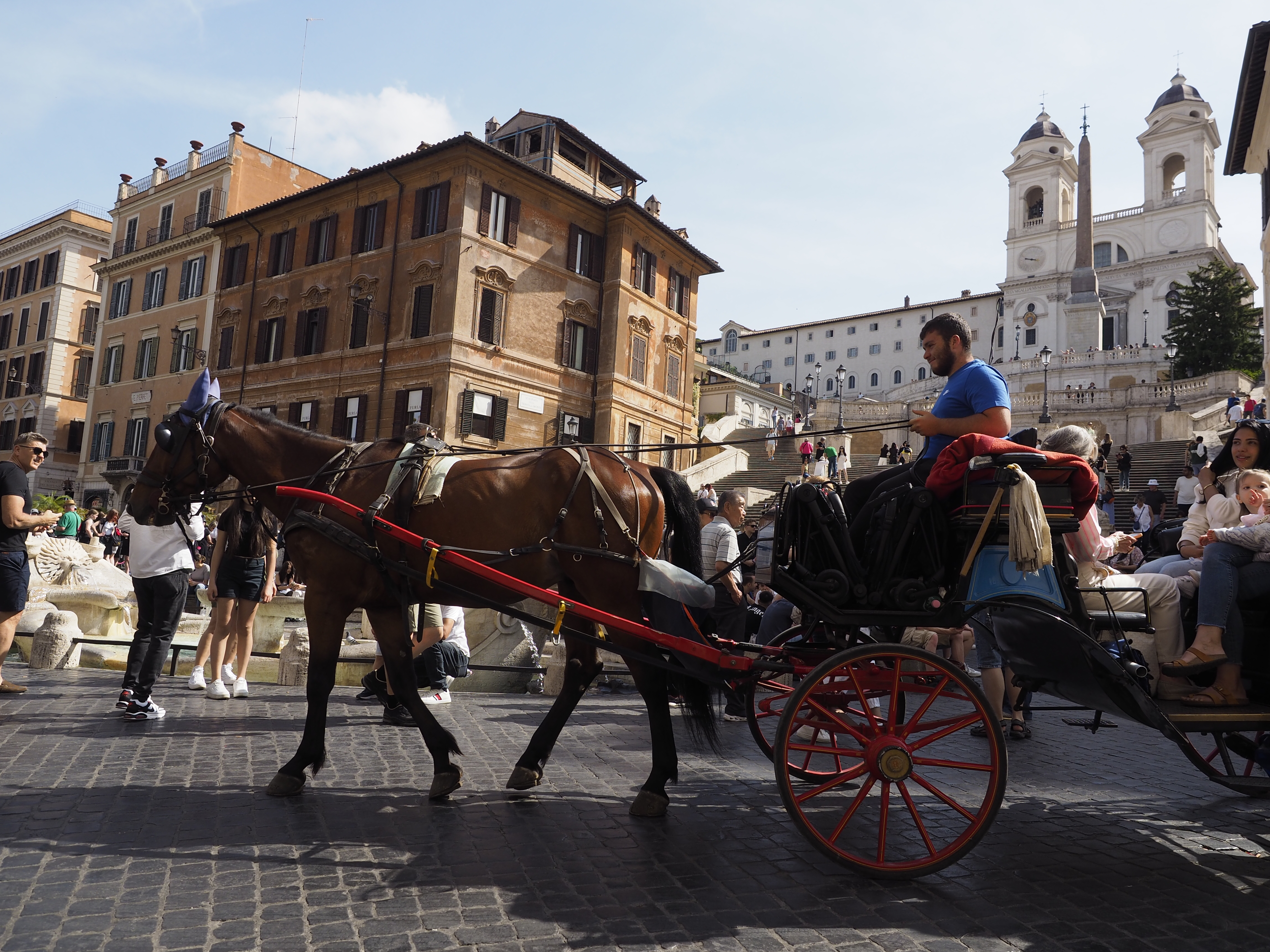 Il rumore della città si attenua appena giunto a Piazza di Spagna. Le scale scivolano verso di me come un invito a fermarsi un attimo e osservare: dal basso il carro con il suo cavallo è pronto a partire, dall’alto sembra aprirsi un altro piccolo mondo sospeso nel tempo, dove turisti e romani condividono lo stesso spazio, senza fretta.